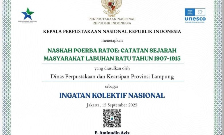 Bandar Lampung, — Surya bangkit com–Prestasi membanggakan kembali diraih oleh Provinsi Lampung di kancah nasional. Dua naskah kuno asal Provinsi Lampung berhasil meraih Sertifikat IKON (Ingatan Kolektif Nasional) Tahun 2025 dari Perpustakaan Nasional Republik Indonesia (Perpusnas RI).