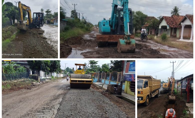 Di ruas Kali Rejo – Bangun Rejo, petugas melakukan pengerukan saluran air serta penimbunan jalan berlubang agar tetap dapat dilalui kendaraan masyarakat dengan aman.
